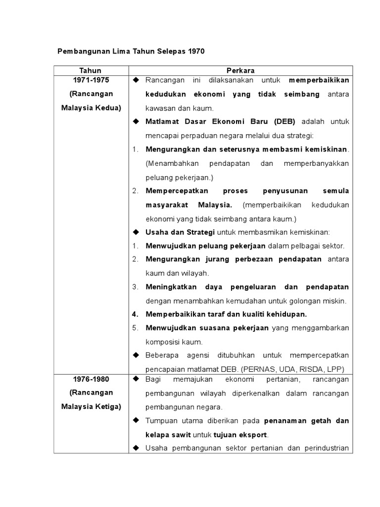 Mempelbagaikan sumber negara dan mengurangkan kebergantungan kepada sektor tertentu. Program pembangunan pertanian & industri diteruskan untuk pembangunan wilayah dipergiatkan Rancangan malaysia merupakan rancangan lima tahun pembangunan kerajaan malaysia. 2005 � 2025 yang selanjutnya disebut sebagai rpjp. Repelita i mulai dilaksanakan sejak tanggal 1 april 1969 hingga 31 maret 1974.